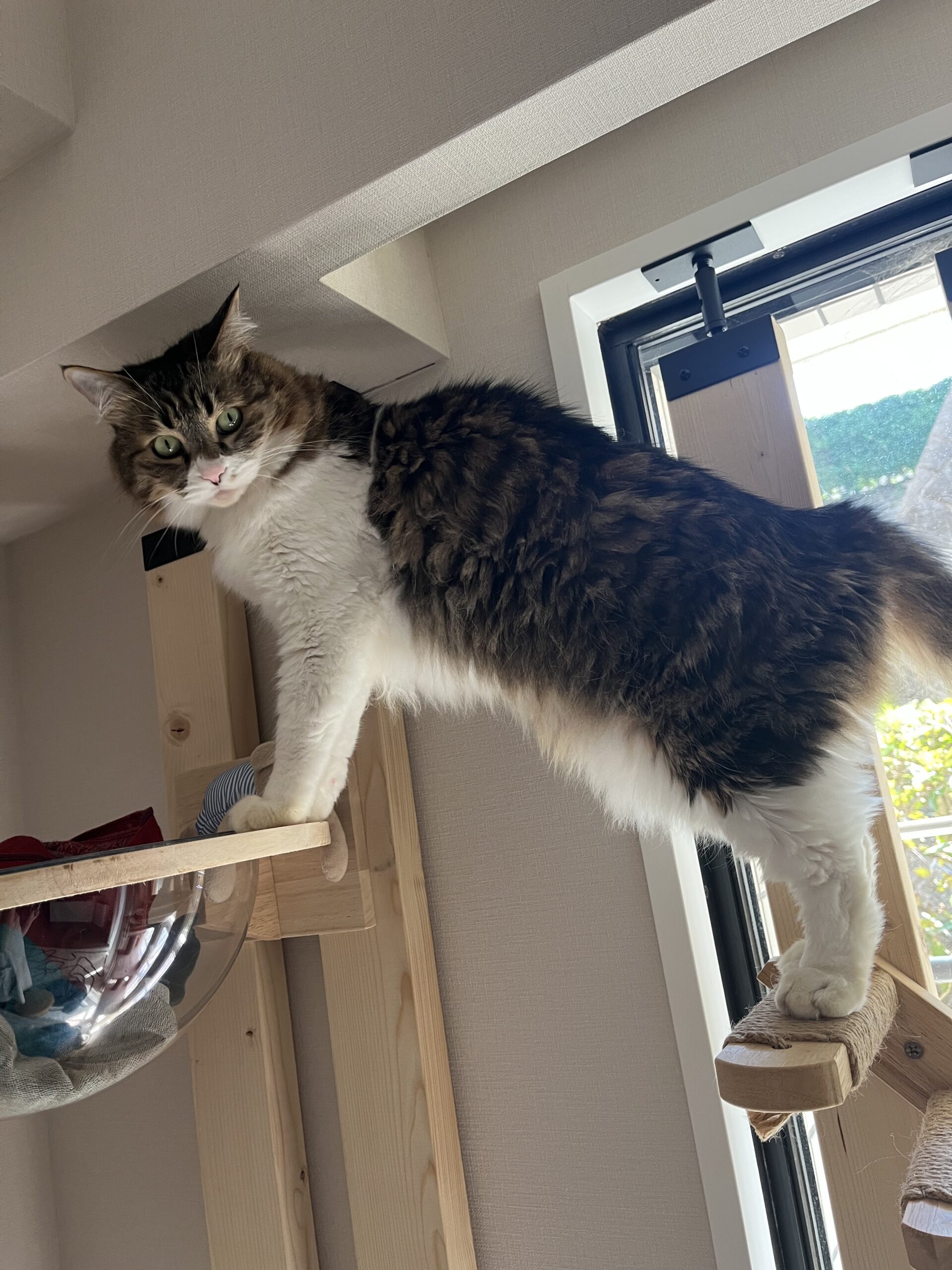キャットタワーの上から降りてきてくれず、いつも喜んでくれるブラシもこの日はお断り。