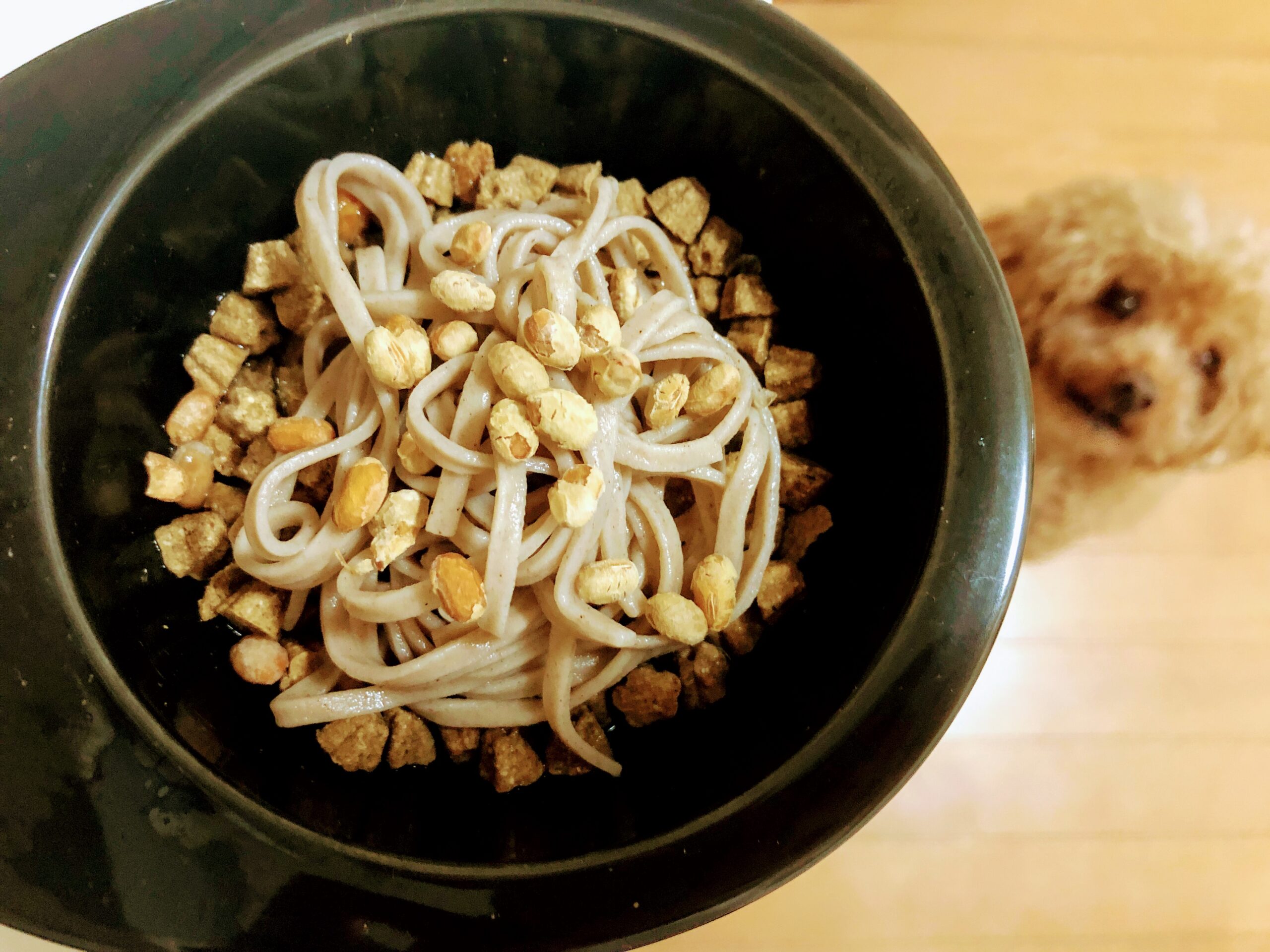 いつものようにベースはドッグフードですが、茹でたお蕎麦、その上に、わんちゃん用のドライ納豆を乗せました。