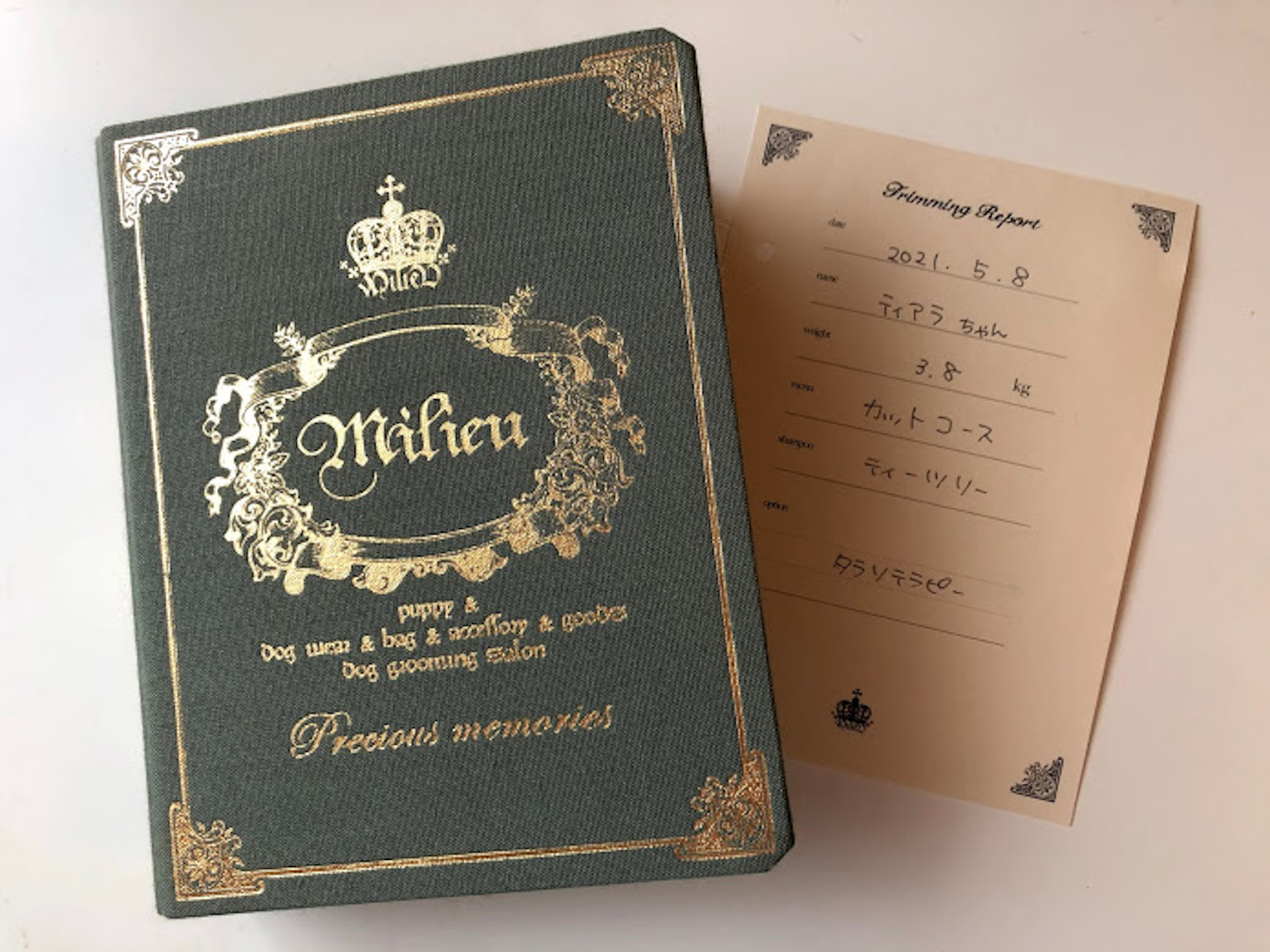 こちらは、毎回頂くトリミングの報告書です。 お店から頂いた可愛いファイルにファイリングしています。皮膚の状態やトリミングの様子のほか、体重も記載していただけるので、健康管理ができるようになりました。