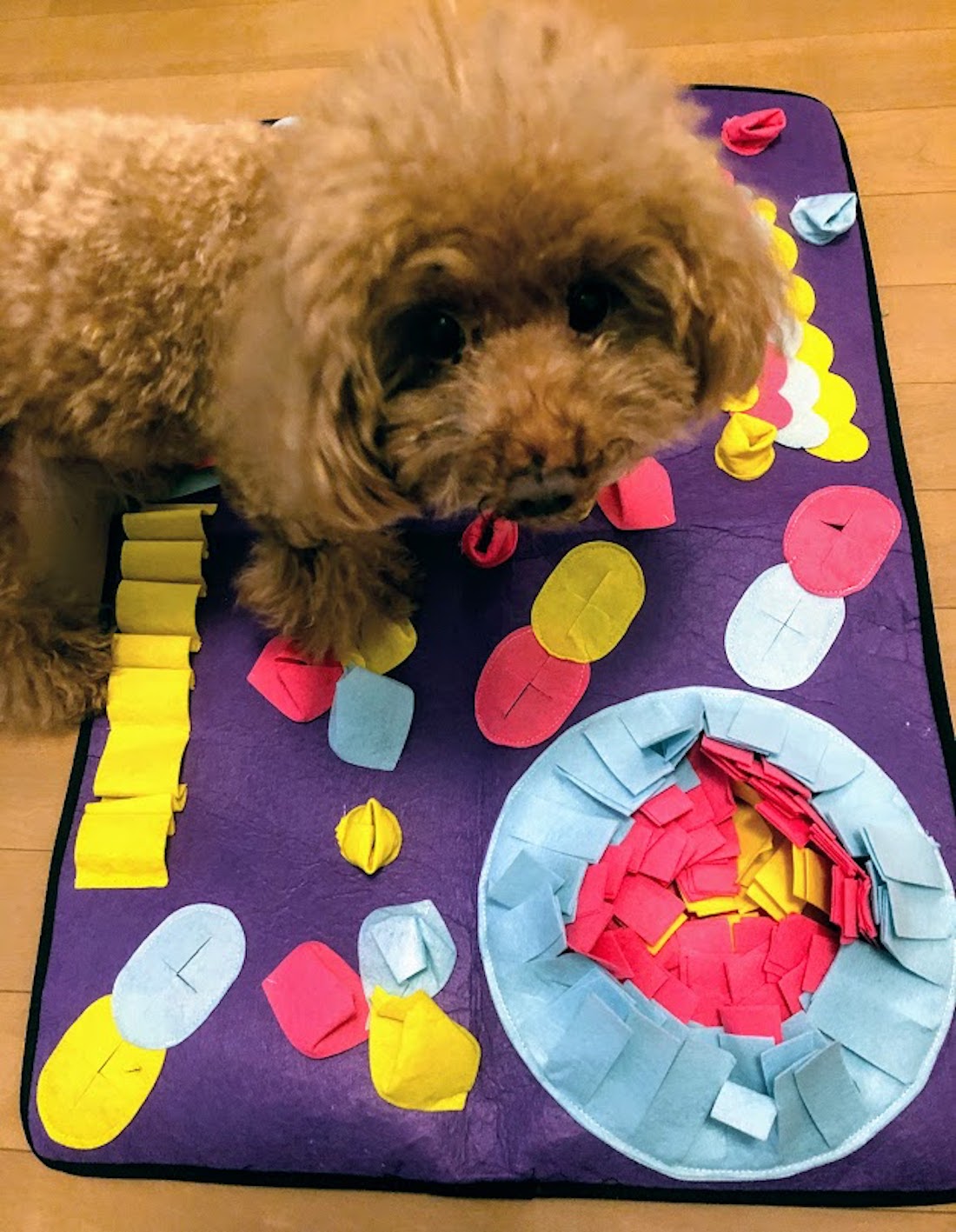 飼い主さんが、フェルト生地でできたマットの中に、お菓子やフードを隠して、犬が嗅覚だけで探し当てる宝探しゲームができます!