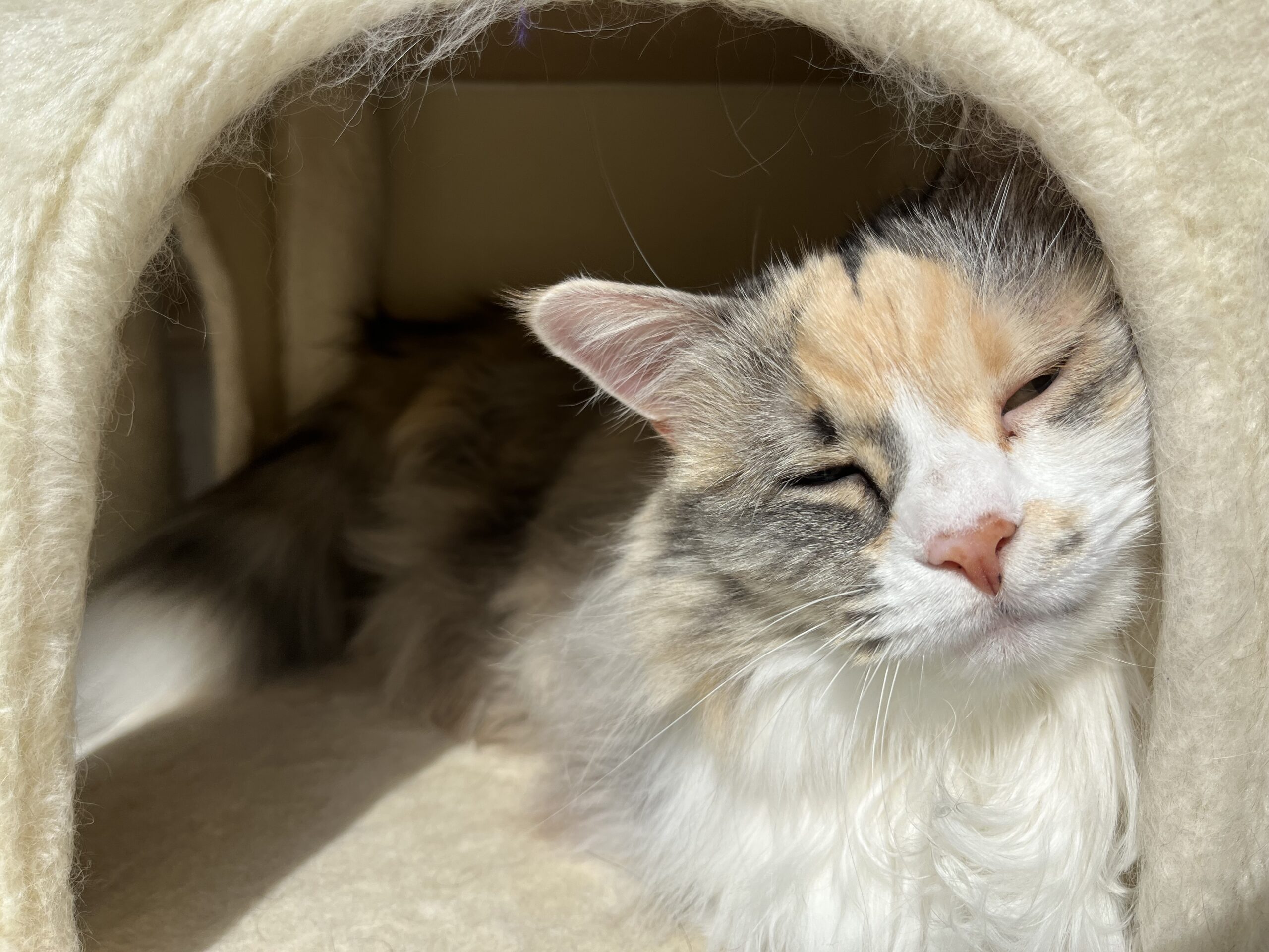 おやつを食べた後のロビーちゃん、天気がいい日は日光浴をしながらうとうと😴