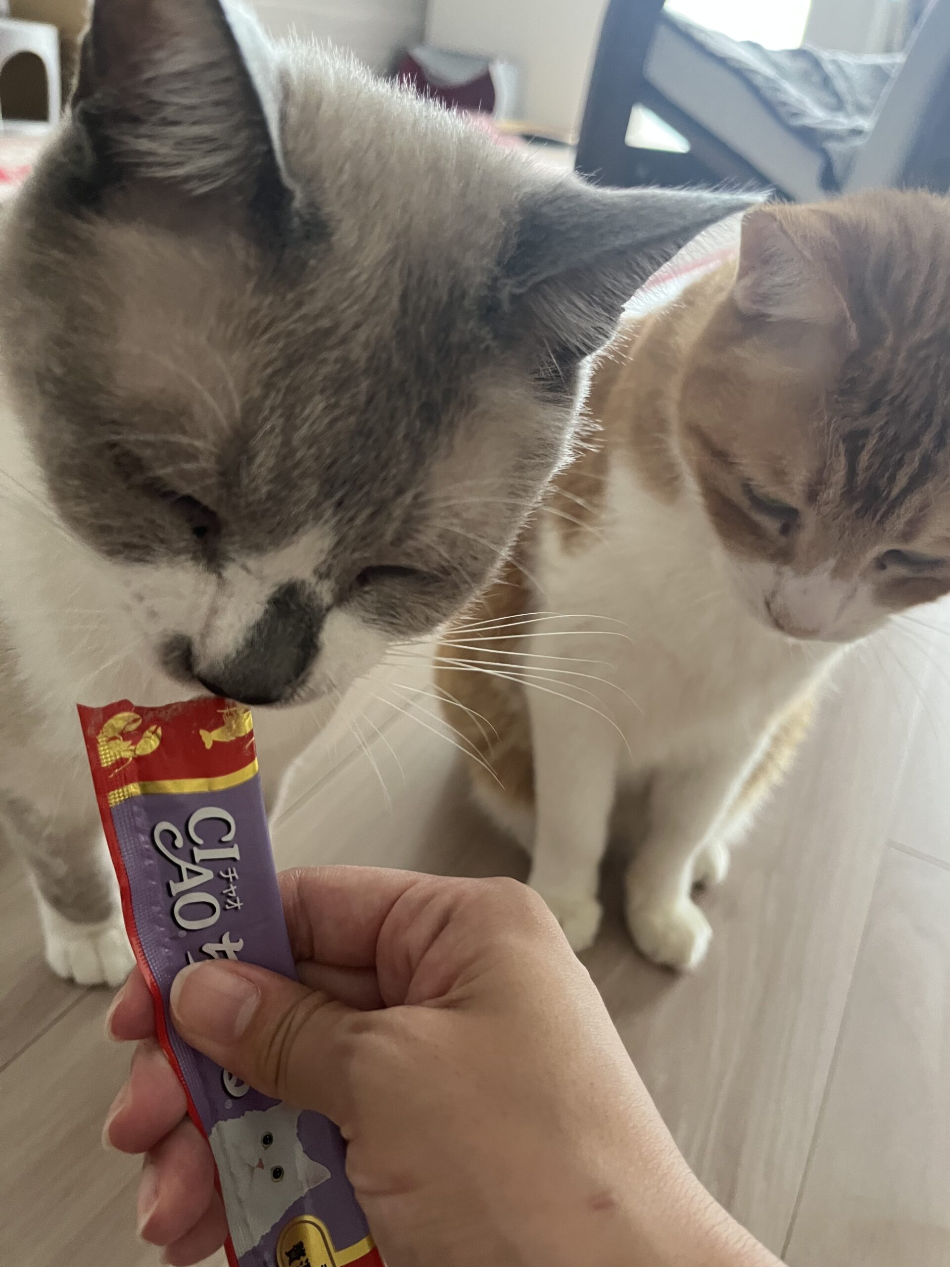 おやつのちゅーるも真っ先にプー太くんがきて、チーズくんは横で順番待ちをしています🤣